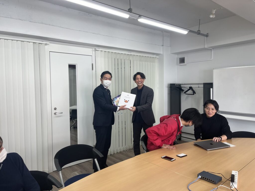 関西からのお土産も用意していたので、その場でお渡しし、記念に“贈呈式風”の写真も撮らせていただきました。