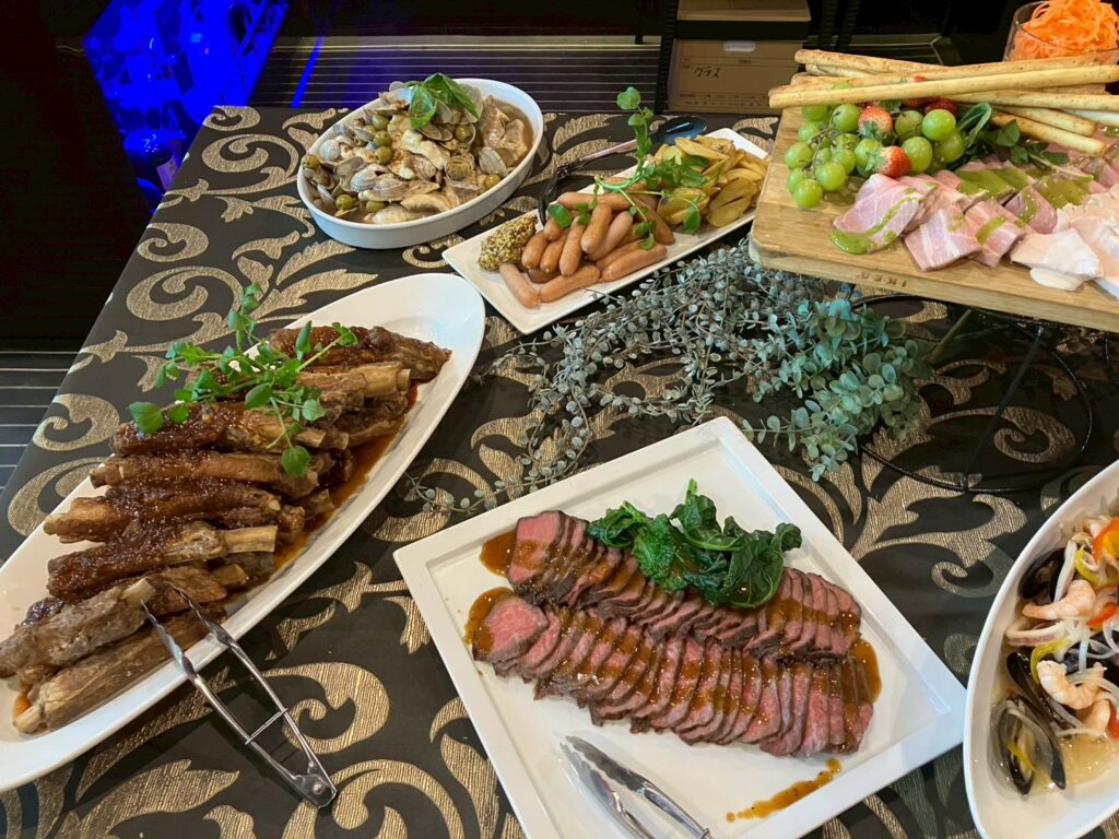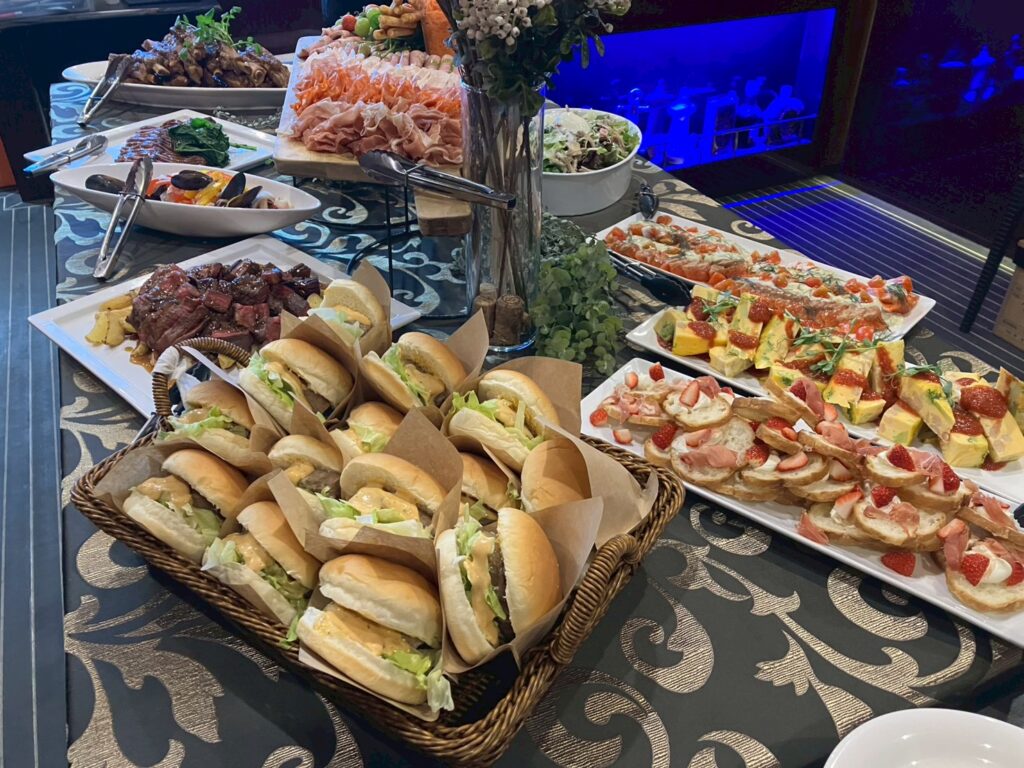 お食事は豪華なビュッフェ形式。ローストビーフや生ハム、カルパッチョ、キッシュ、ハンバーガーなど、どれも見た目が華やかで、とても美味しかったです。