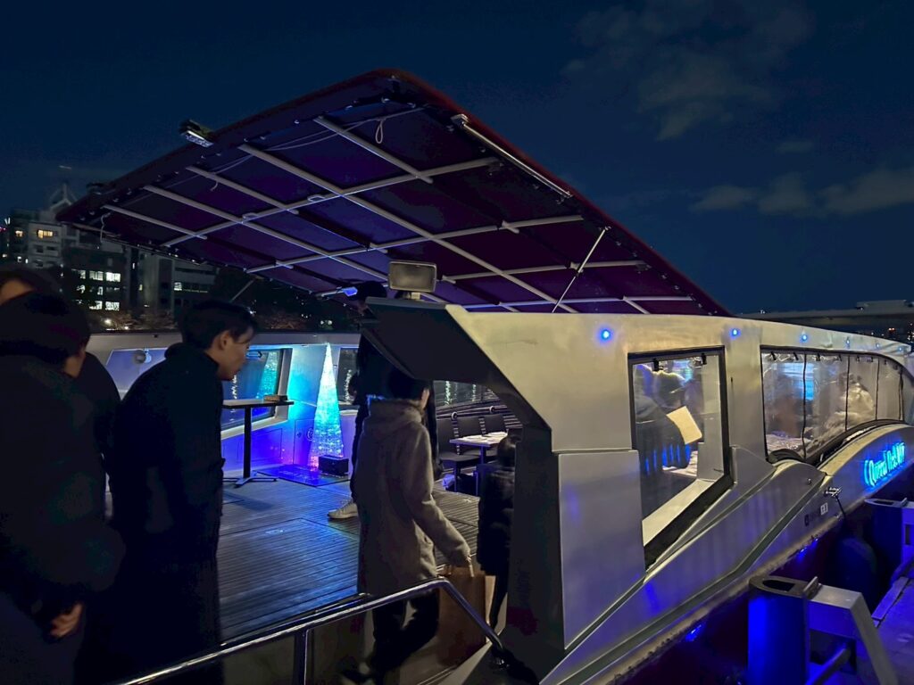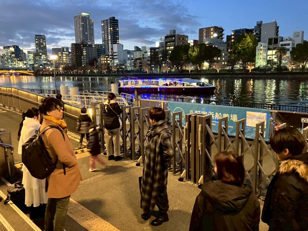 この日は気温がかなり低く、船の上はさらに冷え込んでいましたが、「イルミネーションが見られる」と聞いて、思い切って2階デッキへ。