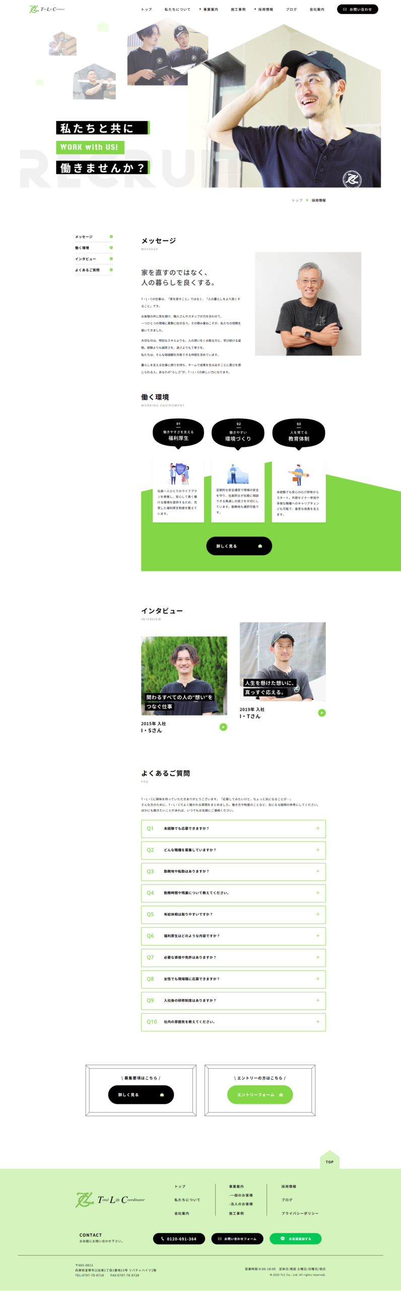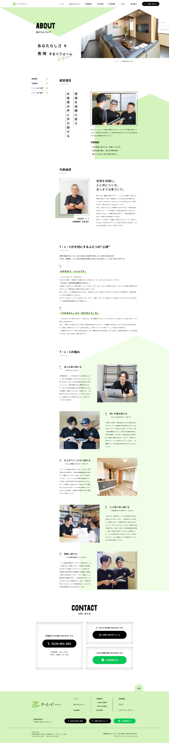 「“信用を信頼に。人と共につくる、まっすぐな家づくり。”という思いを、デザインで体現する」をテーマにスタートした今回のプロジェクト。 リフォーム・リノベーション会社として、地域密着の温かさと信頼感を両立することを目指しました。 ファーストビューでは、T・L・Cの想いや人の魅力が伝わるコピーと写真で印象づけ、セカンドビュー以降は余白を活かしたレイアウトで読みやすさと清潔感を意識。 また、「一般のお客様」「法人のお客様」「採用」の3軸が明確に伝わる構成と導線設計により、集客・採用双方で活用できるサイトへと仕上げました。